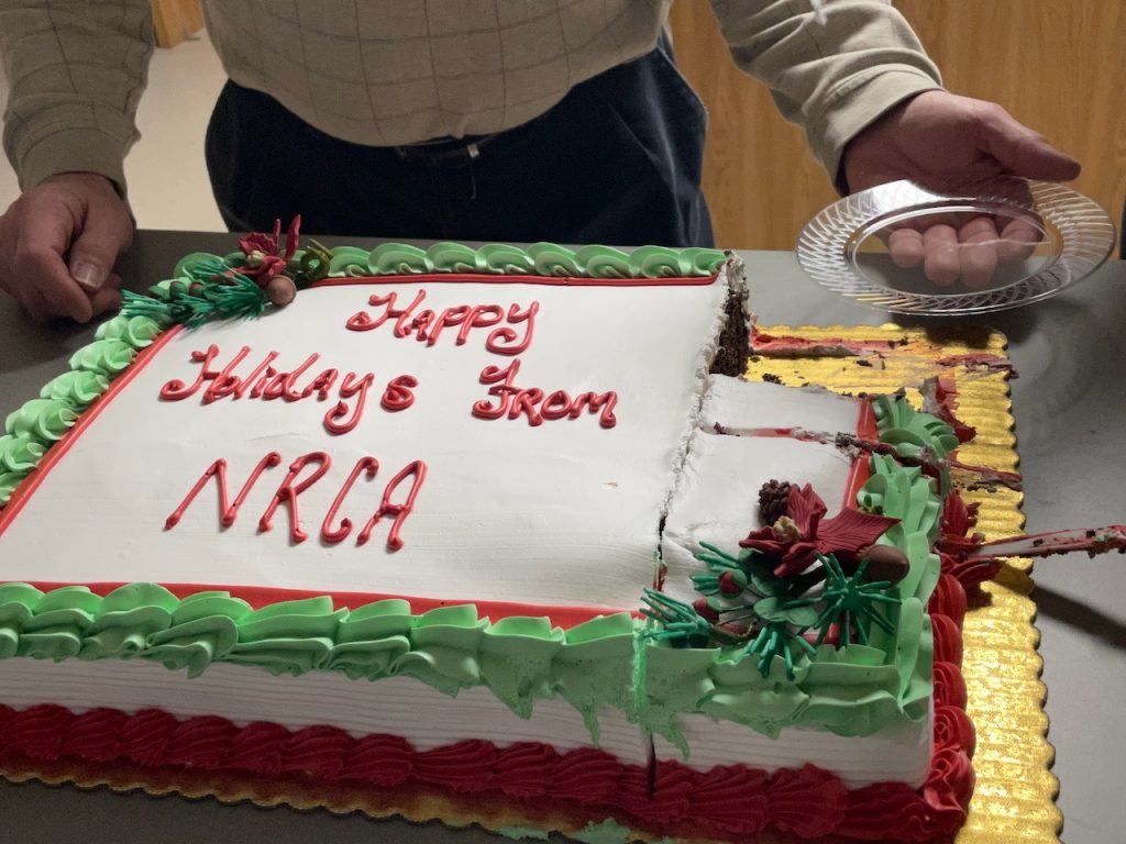 지난 목요일은 내가 봉사하고 있는 NRCA (헤드 스타트 사외이사? 그런 직책) 월례 미팅이 있었다. 매월 세 번째 목요일 저녁마다 프로그램의 성과나 예결산을 리뷰하고 중요한 의결을 하는 미팅이 있는데, 모두들 무보수 자원봉사로 일하고 있지만 미팅을 하는 동안에 먹을 저녁 식사를 준다. 지난 목요일의 미팅은 저녁 도시락에 더해서 연말 축하 케익도 특별히 주문을 했다.