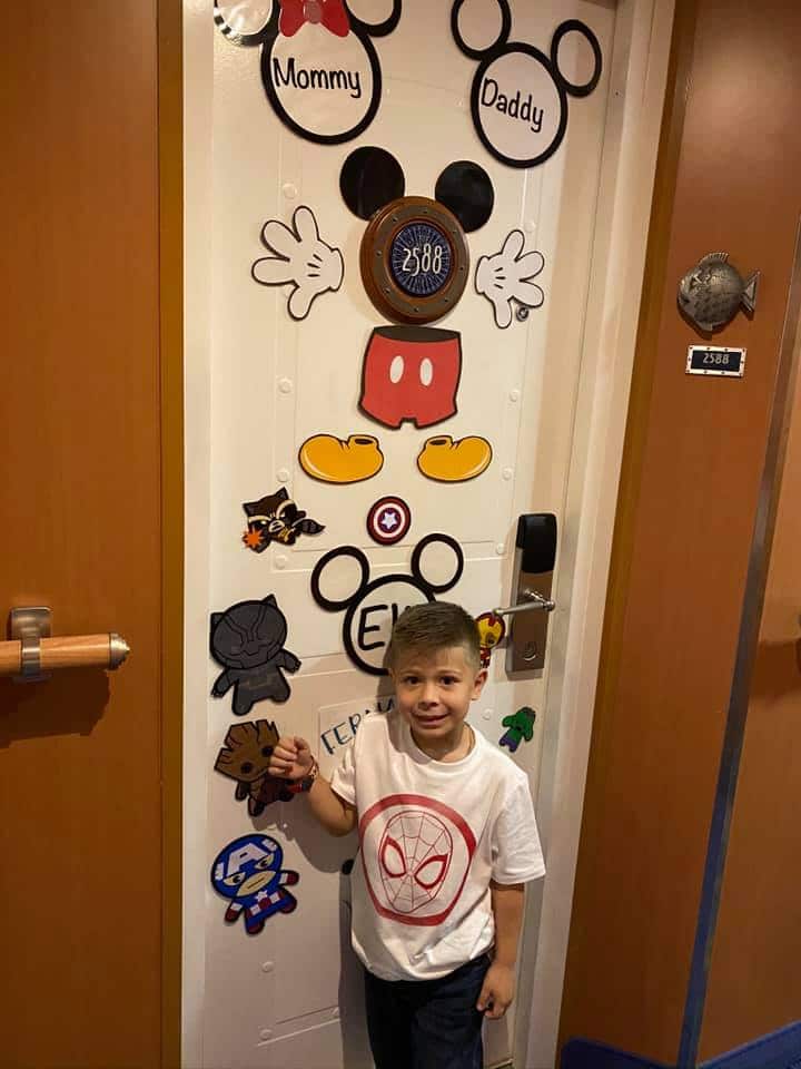 긴 복도를 따라 똑같이 생긴 방문 앞을 지나가다보면 우리 객실이 여기인지 저기인지 순간 헷갈릴 수 있다. 더구나 키가 작은 아이들과 숫자를 아직 잘 못읽는 아이들은 문에 가족들만의 특별한 장식을 해두면 쉽게 객실을 찾을 수 있다. 문을 열고 드나들 때마다 디즈니 크루즈를 한 번 더 상기시키는 역할도 한다. 디즈니 크루즈에서는 자석으로 만든 장식품은 얼마든지 문에 붙이게 하지만 접착 테이프는 금지하고 있다. 우리 가족은 피쉬 익스텐더에 선물 주머니를 걸어두어서 따로 표시가 없어도 객실 구분이 잘 되었다.